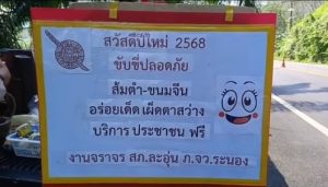 งานจราจร สภ.ละอุ่น ภ.จว.ระนอง กระฉูดไอเดีย แจก “หมวกกันน็อค” และ “ส้มตำ ขนมจีน อร่อยเด็ด เผ็ดตาสว่าง สร่างทันที” ให้กับประชาชนที่สัญจรบนเส้นทาง ในห้วงเทศกาลปีใหม่